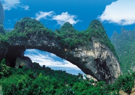 月亮山公園以直徑約20 米形如明月的天然山洞穿過高高的山頭而得名。月亮山海拔380米 ,相對(duì)高度230米 ,長410米 ,寬 220米 ,山體面積9.02公頃。1981年筑登山道,800 余級(jí),陽朔大理石鋪成,直達(dá)月洞;洞高、寬約50米 ,形如半圓拱門;山壁卻只有幾米厚,洞壁平整似墻,洞頂拄滿形態(tài)各異的鐘乳石。