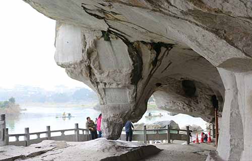 還珠洞位于伏波山的山腹,坐船或從陸地步行入洞。洞內(nèi)高4—6米,寬 6—8米,總長120余米,面積600余平方米。還珠洞內(nèi)的文物石刻很多,是伏波山的精華所在。還珠洞還是唐朝除西山的慶林寺外,又一個佛教圣地。信奉佛教的僧徒們,在洞內(nèi)雕塑了許多佛像。千佛巖中有許多尚未成形的粗鑿佛像,猶如風化剝蝕的斧鑿痕。