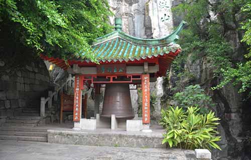 伏波山的回廊中存放著直徑1米多,高近1米,重約2000斤的“千人鍋”,還珠洞口的鐘亭存放著鑄造于康熙八年(公元1669年)的大鐵鐘,重5048斤。
